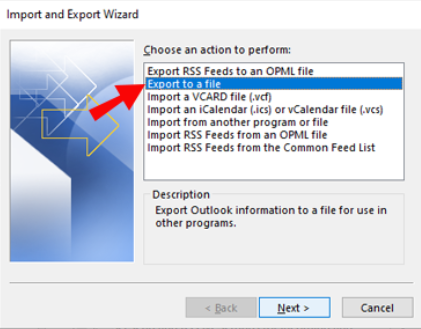 3.Klicka påExportera till en filalternativ påImportera och exportera guidenfråga och klickaNästa >.