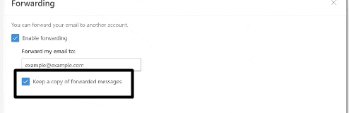 11.VäljVidarebefordra en kopia av inkommande e-post till [Din nya e-postadress]alternativknapp för att aktivera vidarebefordran av e-post.
