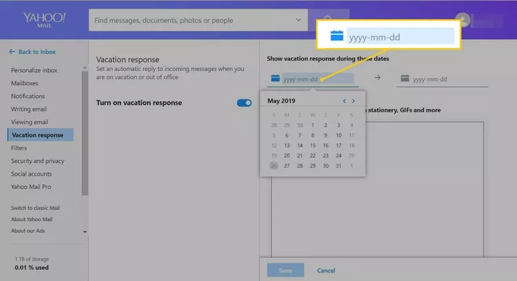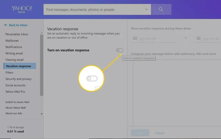 Du kan kontrollera stegen nedan för att skapa ett automatiskt svar i Yahoo! Mail för att informera användare om e-poständringen: