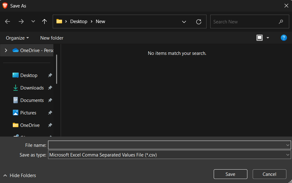 5.Till sist, namnge filen vad du vill och klicka påSparaknappen för att ladda ner .csv-filen på ditt system.