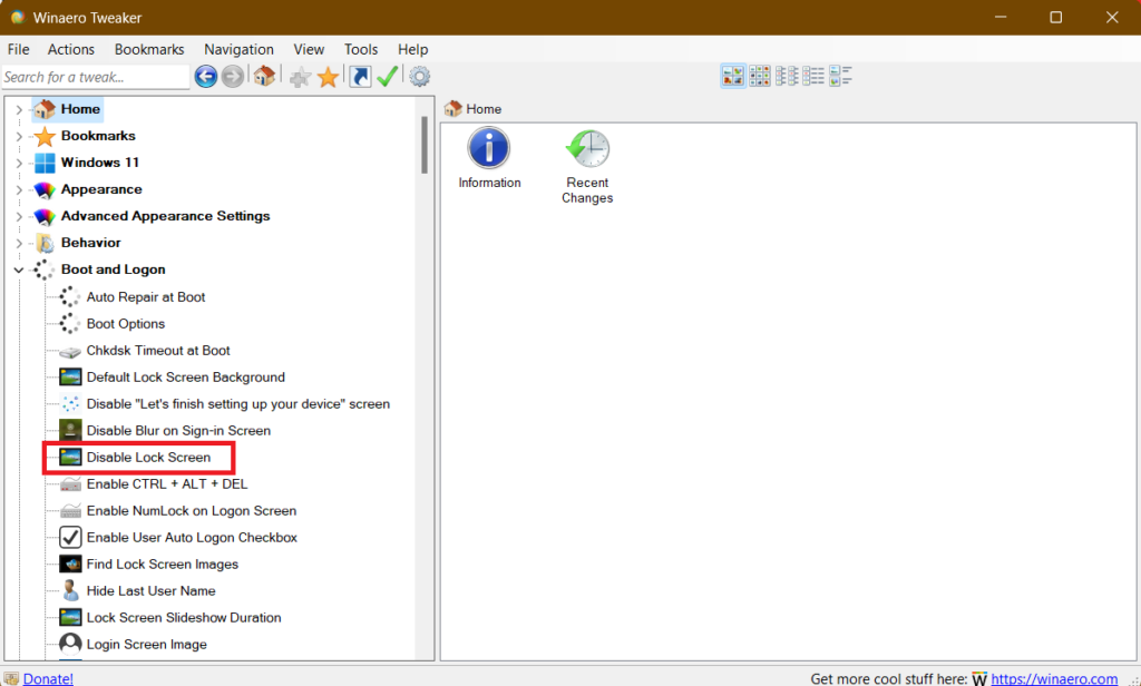 Dessutom, för användarens fördel, erbjuder Winaero Tweaker ett direkt alternativ för att inaktivera låsskärmen i Windows 11, vilket sparar dig från att fördjupa dig i registernycklar eller navigera i komplexa policyinställningar. Så här kan du inaktivera låsskärmen med Winaero Tweaker: