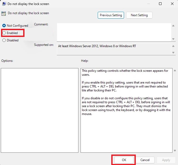 Liksom registerredigeraren tillhandahåller grupprincipredigeraren ett centraliserat sätt att hantera inställningarna för låsskärmen. Dessutom erbjuder det ett mer användarvänligt gränssnitt jämfört med registret, och det eliminerar också behovet av manuellt värdeskapande, vilket vi gjorde i det sista steget i den tidigare metoden. Följ dessa steg för att inaktivera låsskärmen i Windows 11 med hjälp av grupprincipredigeraren: