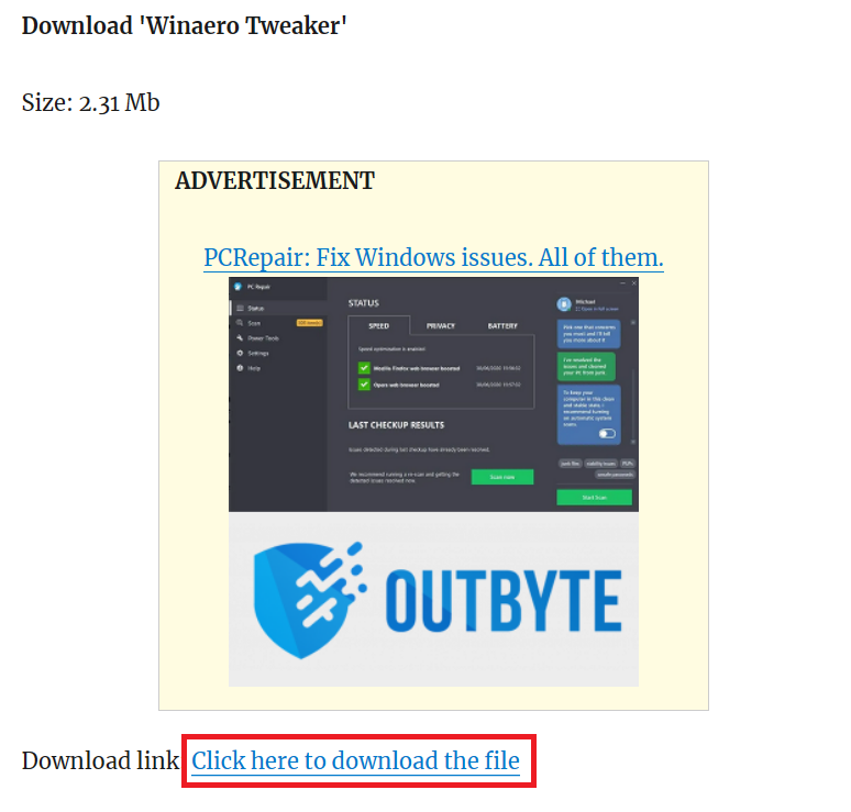 1.Starta standardwebbläsaren på din dator och gå till Winaero Tweakers officiella webbplats, eller så kan du ocksåklicka här.