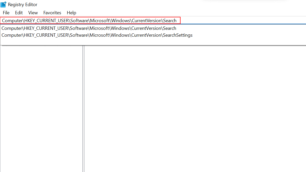 - Kopiera följande sökväg: HKEY_CURRENT_USERSoftwareMicrosoftWindowsCurrentVersionSearch > klistra in den i textfältet.