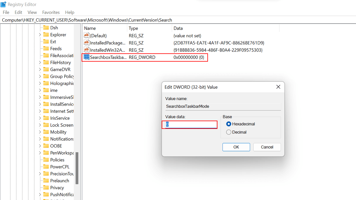 - Dubbelklicka påSearchboxTaskbarModetangent > ställ in dess värde till0.