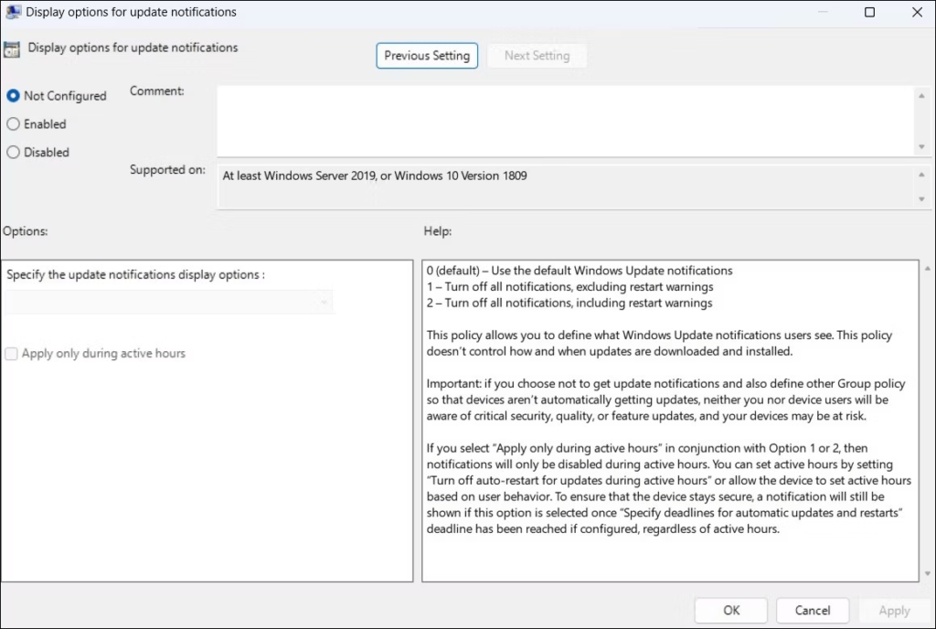 Steg 7:Följ samma instruktioner ovan och ställ inVisa alternativ för uppdateringsmeddelandenpolitik tillEj konfigureradför att senare återaktivera Windows-uppdateringsmeddelanden.