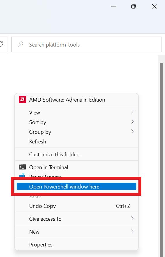 Steg 4:Medan du stannar i den ADB-mappen, tryck påSkift-tangentenochhögerklickavar som helst i mappen.