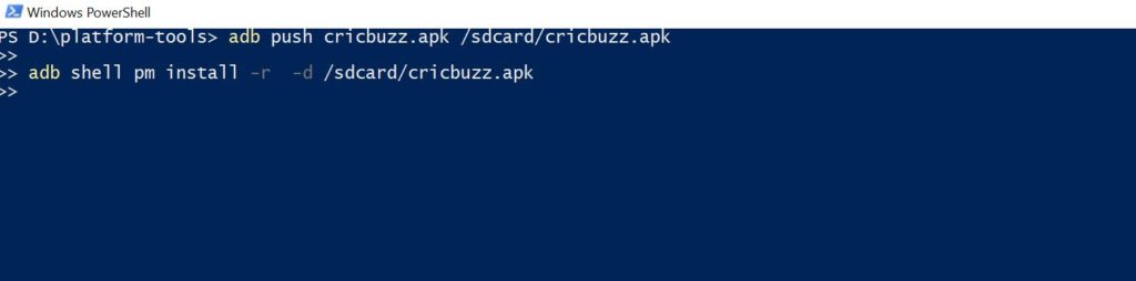 adb-skal pm installera -r -d /sdcard/cricbuzz.apk