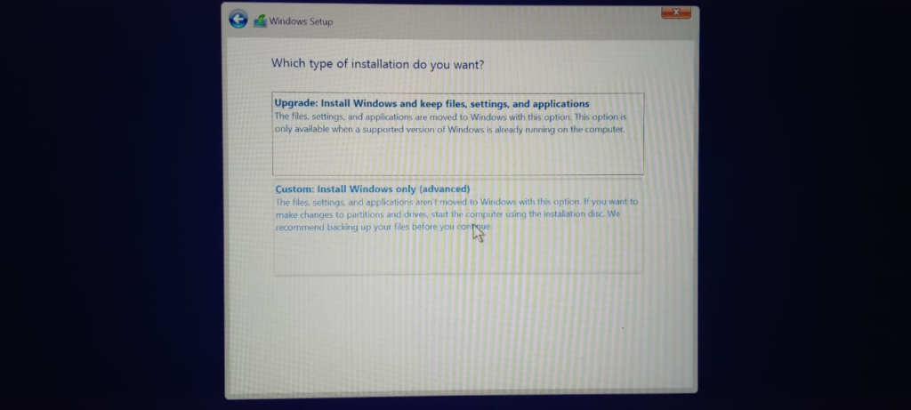 11.Välj nuAnpassad: Installera endast Windows (avancerat)påVilken typ av installation vill du ha?skärm.