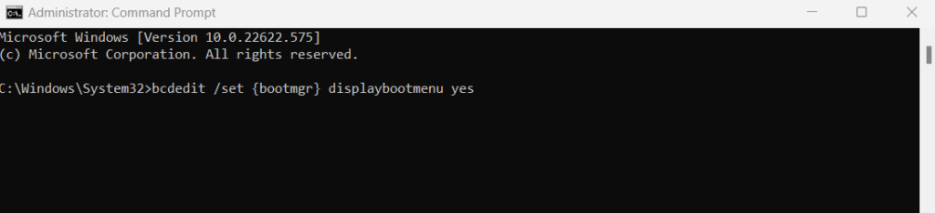 2.Utför det nämnda kommandot och tryckSkriva in:bcdedit /set {bootmgr} displaybootmenu ja