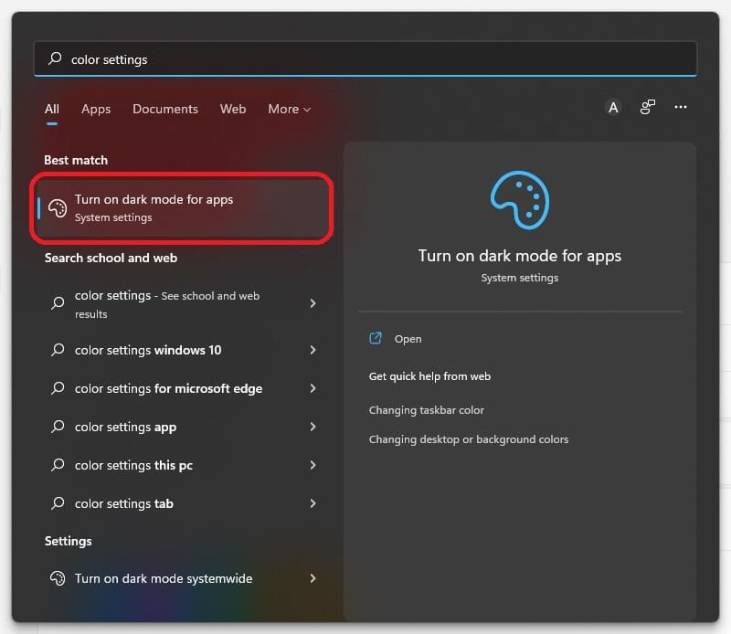 - Öppna Start-menyn > skrivFärginställningaroch tryck på Enter för att öppna appen Inställningar. Du kan också direkt öppna appen Inställningar och gå till Personalisering > Färg.