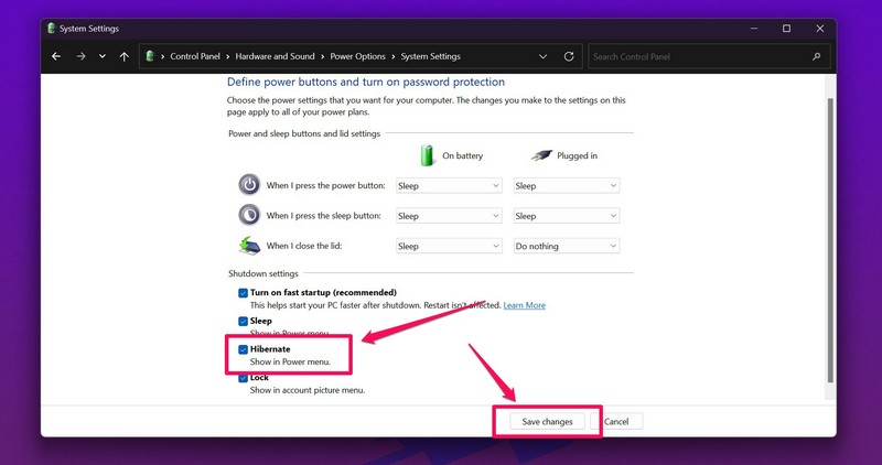 5.Nu,klicka på kryssrutan bredvid alternativet Hibernateför att aktivera det och klicka på knappen Spara ändringar nedan.