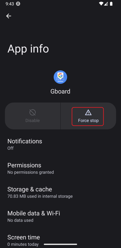 Om standardtangentbordsmetoden redan är vald och tangentbordet fortfarande inte visas, bör du försöka stänga och öppna appen igen. För att starta om en app måste du först tvinga den från inställningarna och sedan starta om den. Så här kan du tvångsstoppa en app:
