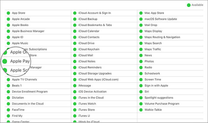 I nuvarande tider fungerar alla betalningar, förutom kontanter, via servrar och molnet. I sällsynta fall kanske webbtjänsterna som Apple Pay använder i bakgrunden inte fungerar. För att kontrollera detta, besök tjänstemannenApples systemstatussida och se om Apple Pay fungerar eller inte. Om det fungerar kommer du att se en grön prick före Apple Pay.