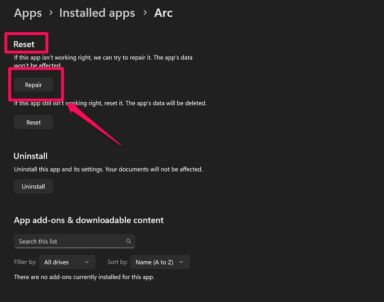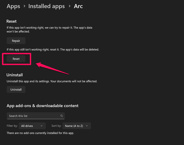 1. Använd steg 1-4från ovan avsnitt tillöppna sidan Avancerade alternativför appen du vill återställa på din PC eller bärbara dator.