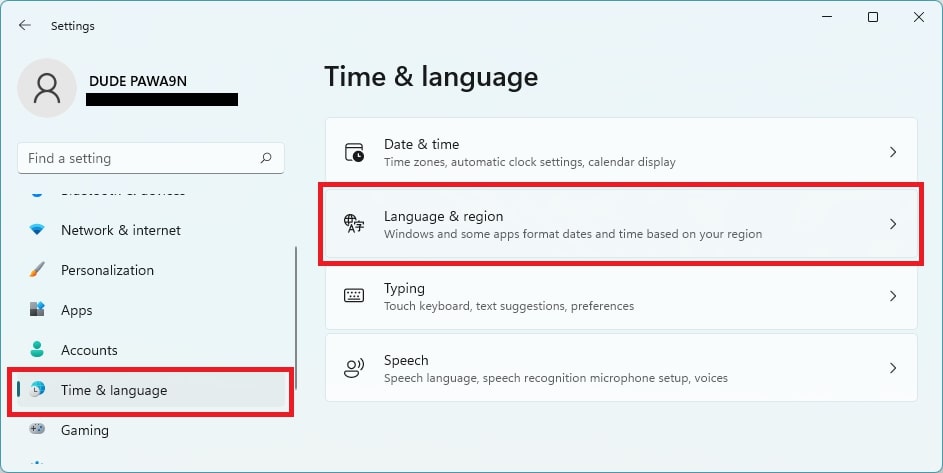 1.Gå tillTid & språkavsnitt av Inställningar från vänster och väljSpråk & region.
