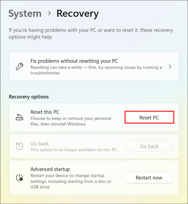 1.I denAppen Inställningar, fortsätt tillÅterhämtningavsnitt och klicka påÅterställ PCpå nästa skärm.