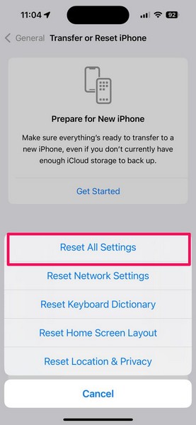Bortsett från buggar och tekniska fel i systemet, kan kontrollcentrets anpassningsproblem inte fungera vara ett resultat av en felkonfigurerad inställning på iPhone. Eftersom det är svårt att upptäcka den specifika inställningsfelkonfigurationen som kan orsaka att Control Center-anpassningen inte fungerar, är ett av de bättre sätten att bli av med det att återställa alla inställningar på enheten.