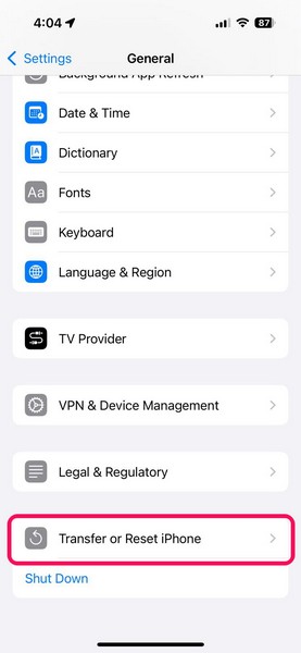 3.Scrolla ner till botten av sidan och tryck påÖverför eller återställ iPhonealternativ.