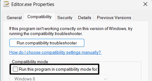 3.I denEgenskaperfönster, gå tillKompatibilitetfliken och markeraKör programmet som administratörkryssrutan för att alltid starta det här programmet med förhöjda rättigheter.