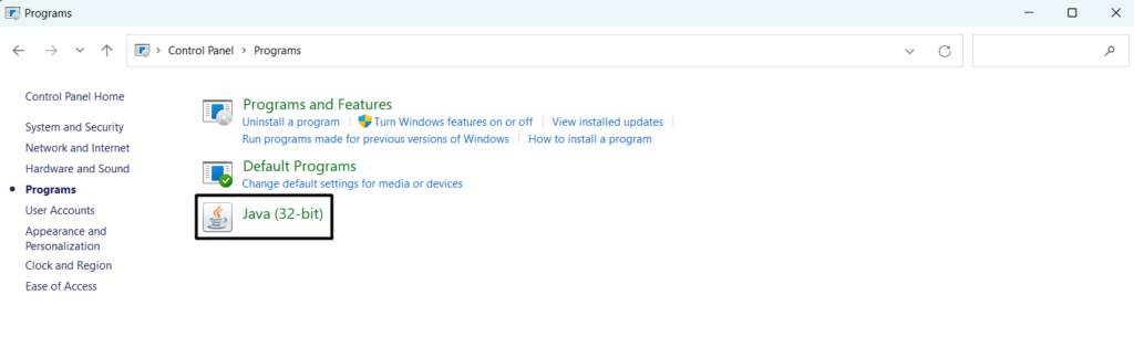 2.I denKontrollpanelenfönstret, väljProgrammeraalternativet och hittaJava (32-bitars)app.