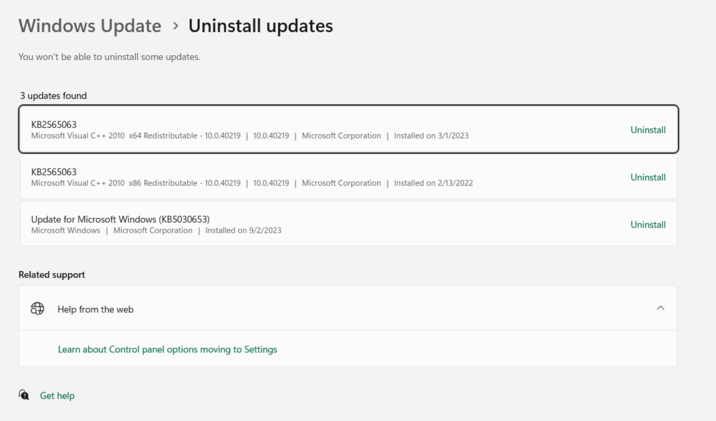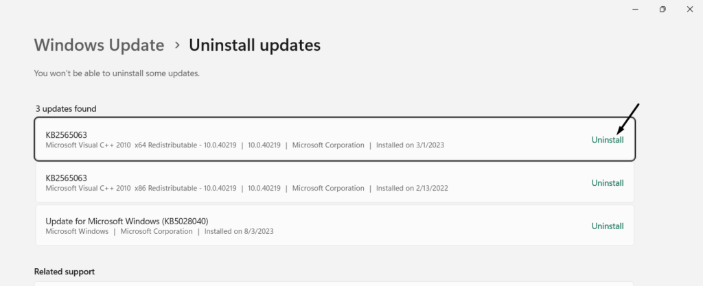 2.PåAvinstallera uppdateringarhitta den motstridiga uppdateringen och klicka påAvinstalleraknappen bredvid.