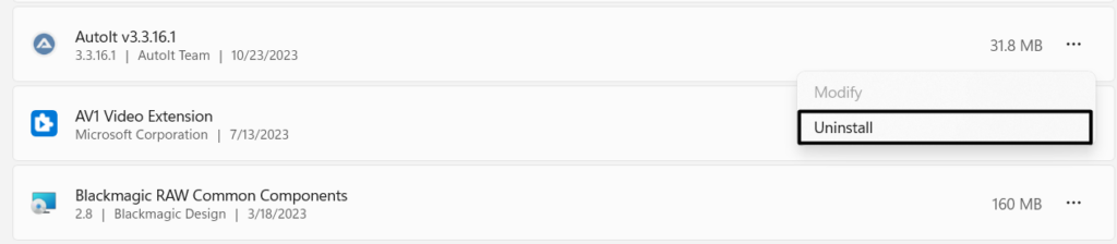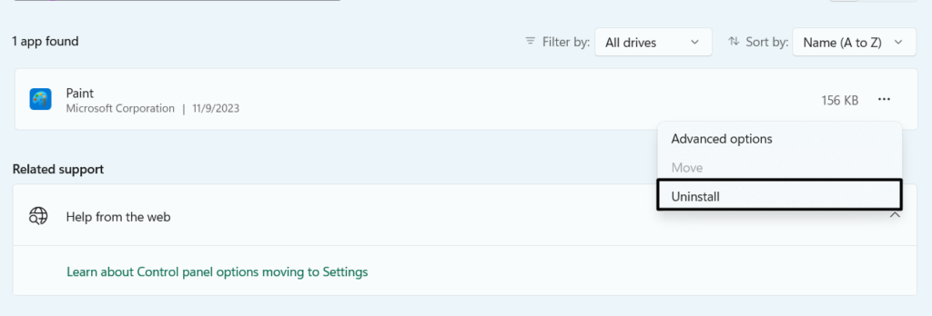 3.Klicka påtre punkter (...)bredvid appen och från rullgardinsmenyn, väljAvinstalleraalternativ.