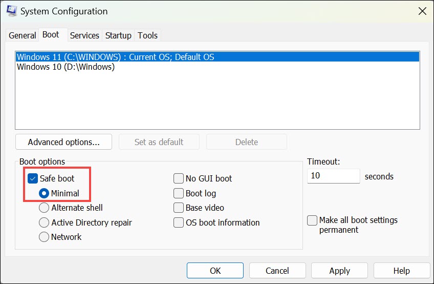 3.I nästa fönster, gå tillKängaflik och underStartalternativ, markeraSäker stövelalternativ.