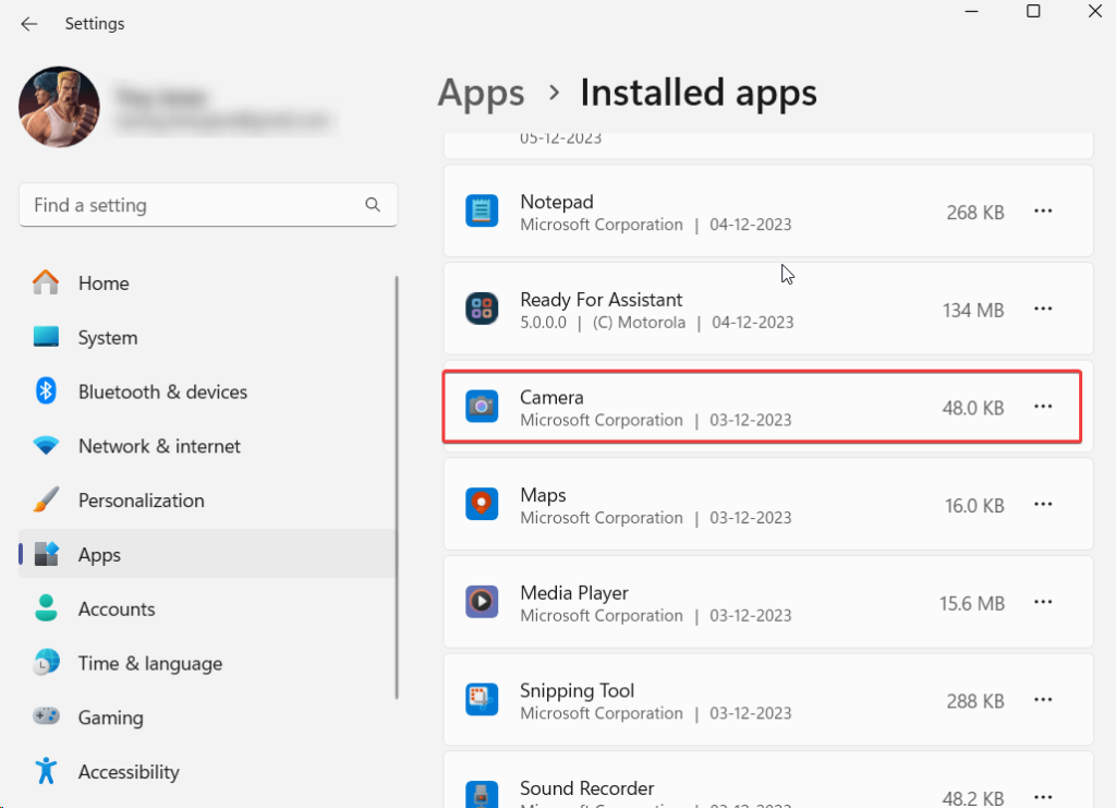 Steg 4 –Scrolla ner, leta uppKamera,och klicka på de tre prickarna bredvid appens namn.
