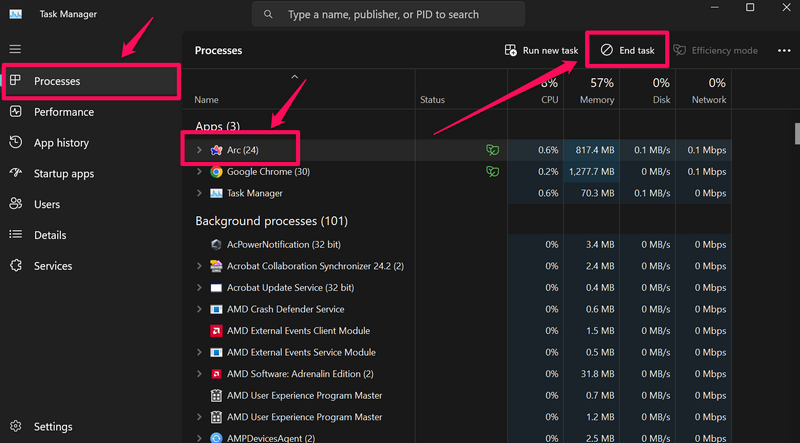 Du kan följa stegen nedan för att tvinga stänga webbläsarappen på din Windows 11-enhet och starta om den igen: