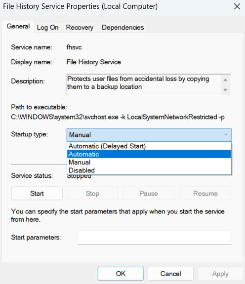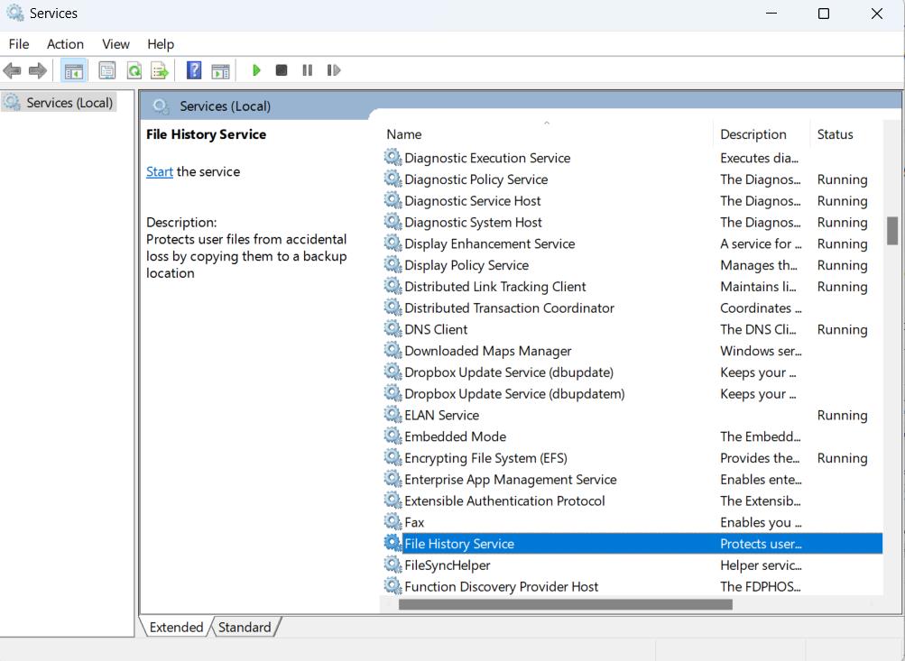 - Filhistoriktjänsten är avstängd eller inte inställd på automatisk.