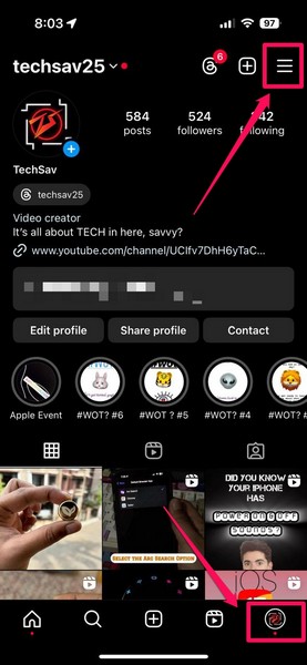 2. Tryck på profilikonenpå det nedre navigeringsfältet och tryck sedan påInställningar och aktivitet (tre-staplar) knappi det övre högra hörnet.