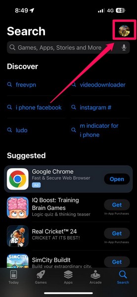 2. Tryck på din profilikoni det övre högra hörnet för att öppna den.