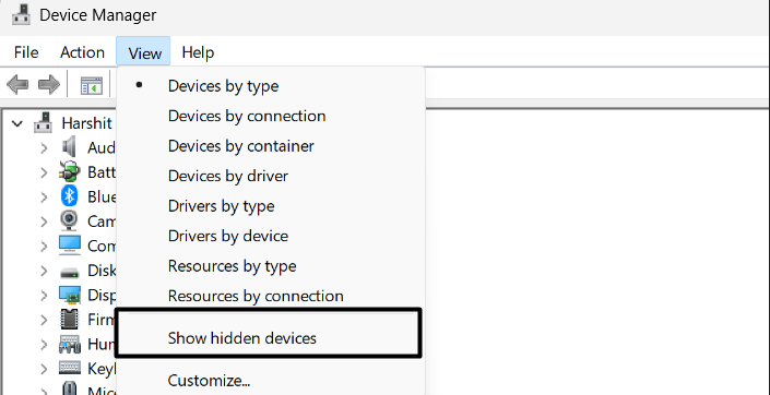 2.VäljaVisa dolda enheterfrån rullgardinsmenyn för att se alla dolda Windows-drivrutiner.