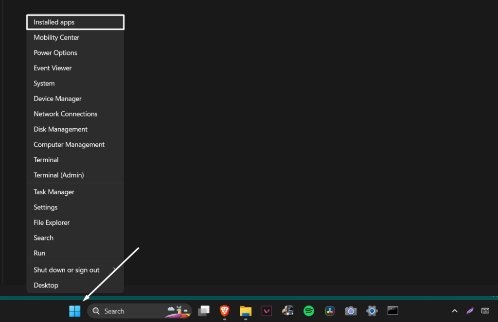 1.Högerklicka påWindows logotypi systemets aktivitetsfält och väljInstallerade apparalternativ från det.