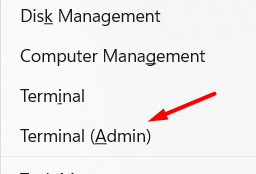 1.Tryck först påWindows + Xkortkommandon för att öppna Windows-menyn och väljTerminal (admin)från det.