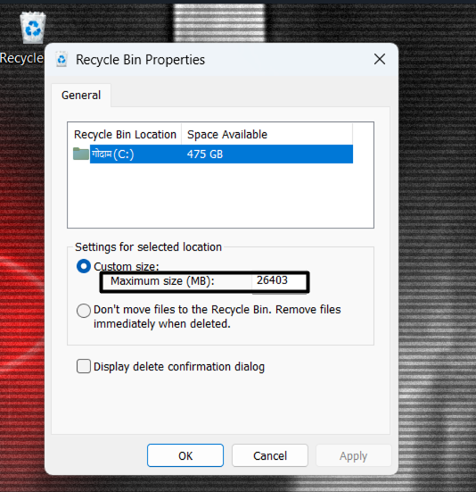 Det kan vara möjligt att din papperskorgs lagringsstorlek är mycket låg, vilket är anledningen till att den inte lagrar nyligen raderade filer. Så,ändra papperskorgens lagringsstorlekoch kontrollera sedan problemets status. Så följ stegen som nämns nedan för att göra samma sak på din Windows 11 PC: