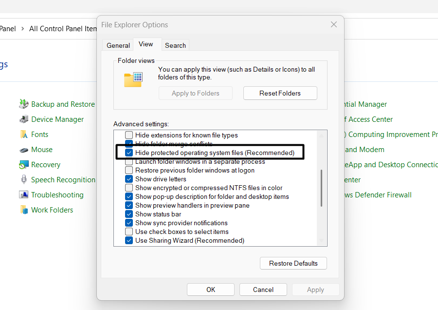 3.I denSefliken, avmarkera rutan motDölj skyddade operativsystemfiler (rekommenderas).