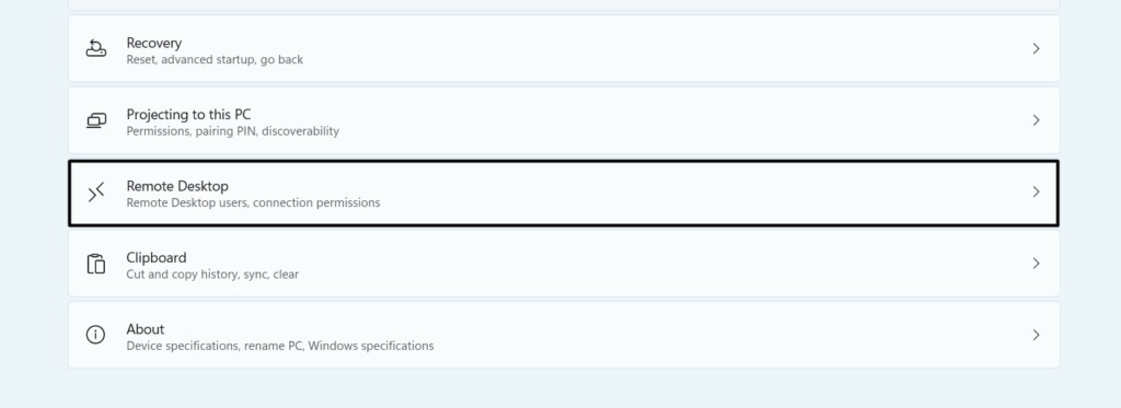 2.Till höger väljer duFjärrskrivbordalternativet för att komma åt alternativen för fjärrskrivbord.