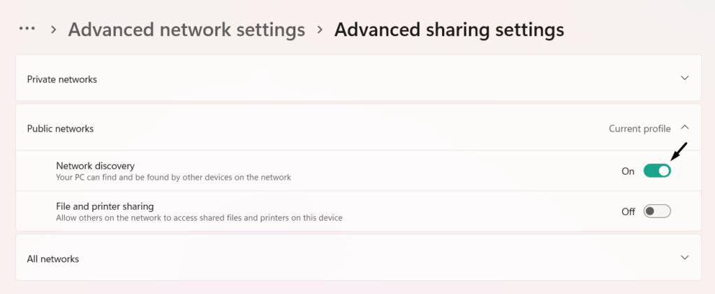 4.BredvidNätverksupptäcktunderOffentliga nätverk, slå på reglaget och lämna fönstret.