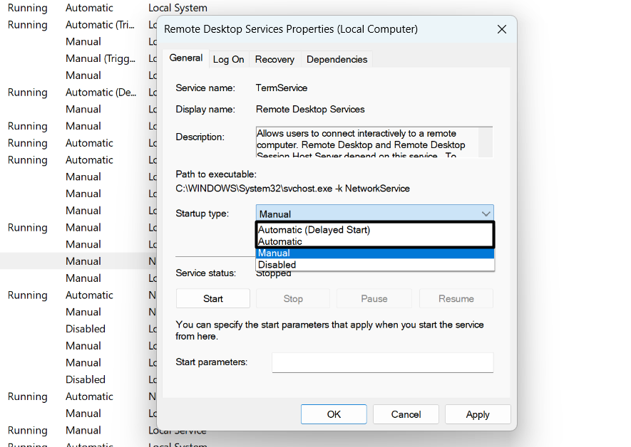 2.I denTjänsterfönster, sök efterFjärrskrivbordstjänsteroch kontrollera omStarttypär inställd påAutomatisk. Om den inte är det högerklickar du på den och väljerEgenskaperfrån menyn.