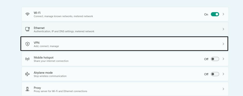 En annan möjlig orsak till att Sandbox inte fungerar på din PC kan vara en aktiverad VPN. Så om du använder en tredjeparts VPN på din PC, föreslår vi att duinaktivera den tillfälligt. Om du använder Windows integrerad VPN, följ stegen nedan för att inaktivera det:
