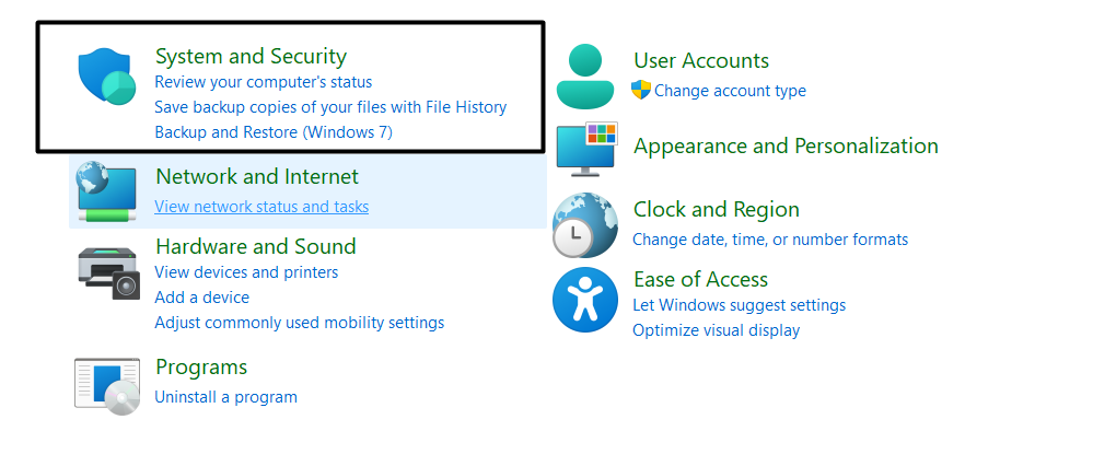 1.För att börja, öppnaProgram för kontrollpanelenpå ditt Windows 11-system och väljSystem och säkerhet.
