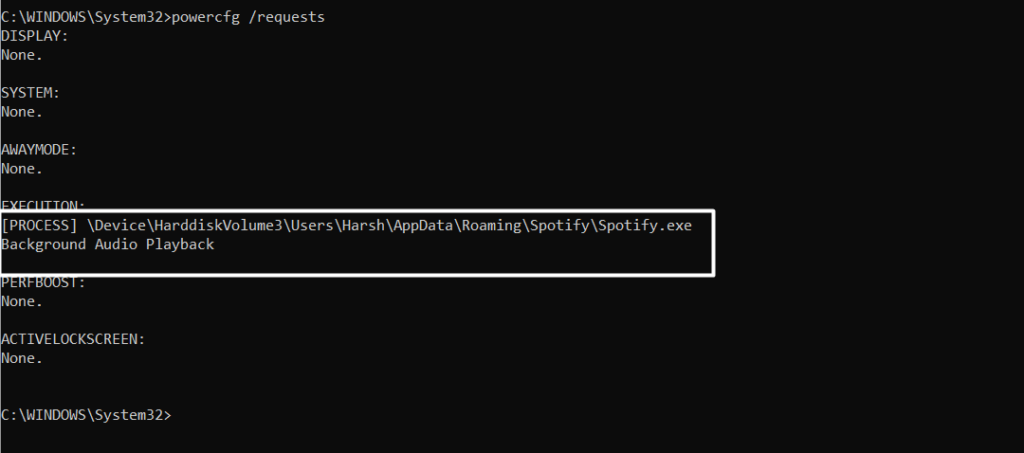 3.Efter att ha kört kommandot ovan kommer du att se flera programs processer underVISNING, BORTA, UTFÖRANDE, PREFBOOST,ochAKTIVLÅSSKÄRMavsnitt. Av allt måste du leta efter processer underBORTNÄGEavsnitt och försök att identifiera källan till processen. Till exempel, i vårt fall, visar det den här processen, som skapas av Spotify-appen.