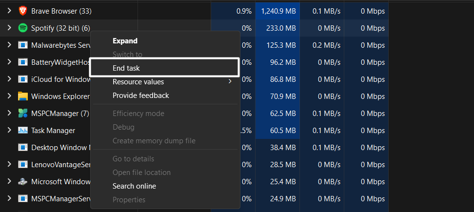 5.Slutligen högerklickar du på programmet iTask Manageroch väljAvsluta uppgiftenfrån högerklicksmenyn.