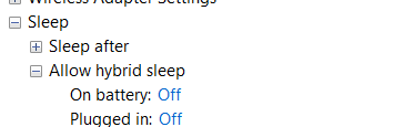 5.Efter det ställer du inPå batteriochInkoppladmöjlighet attAvunderTillåt hybridsömnför att inaktivera hybridläget.