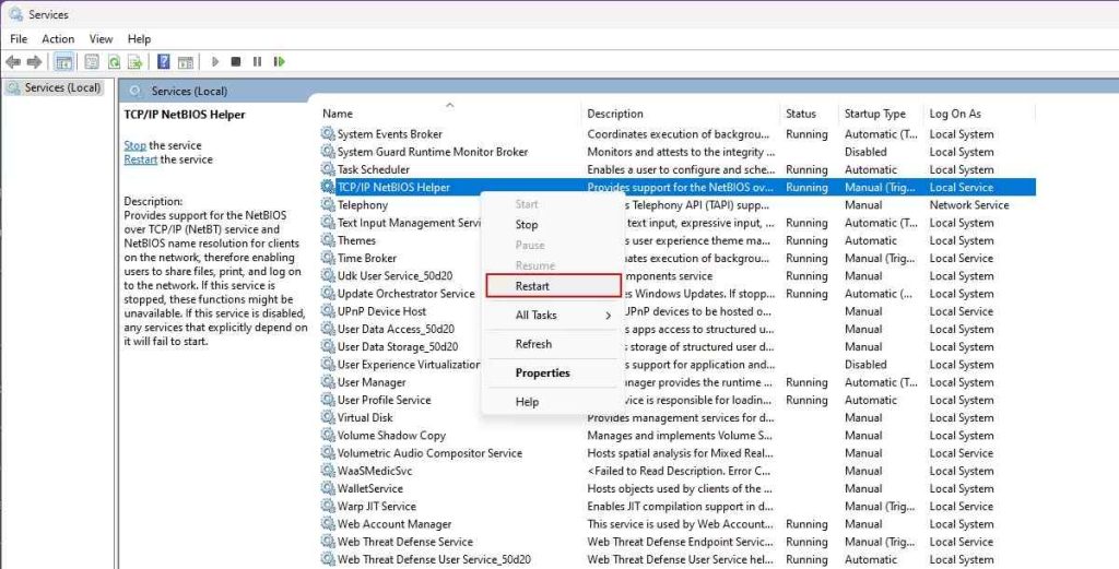 Steg 3:Scrolla sedan ner för att hittaTCP/IP NetBIOS Helperservice. Högerklicka på den och väljStarta omfrån snabbmenyn.