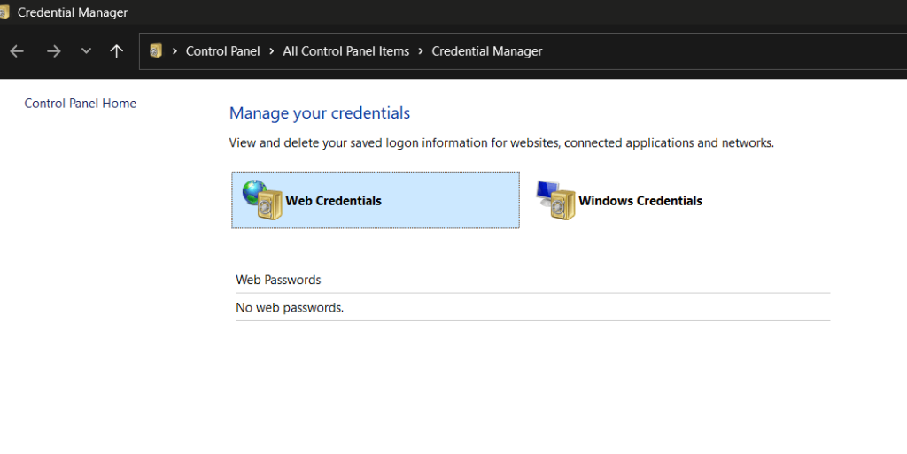 Steg 2:Fönstret Credential Manager visas nu på skärmen. Leta upp och ta bort alla autentiseringsuppgifter som är kopplade till det berörda kontot eller relaterade resurser.