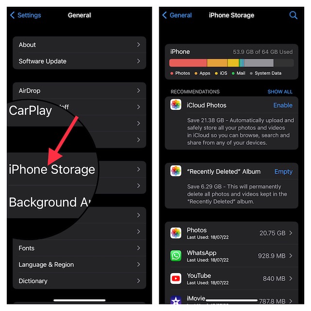 Städa upp din iPhone då och då: Det är bättre att rensa upp lagringen då och då för att förhindra att onödiga filer samlas. iOS erbjuder ett ganska snyggt sätt (Inställningar app -> Allmänt -> iPhone Storage) att hålla reda på lagringsförbrukningen och ger också ett praktiskt sätt att kontrollera hur mycket utrymme varje app har förbrukat. Därmed blir det mycket lättare att lista ut apparna/filerna som kräver lagring och bli av med dem.