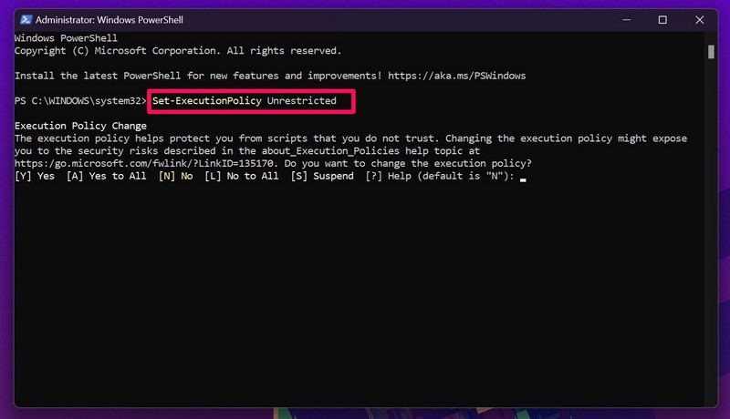 3.TryckaOCHoch tryck på Enter för att bekräfta din åtgärd i Powershell.